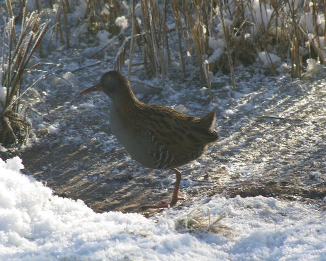 The walk between the hides brought Fieldfare and Redwing though we missed the Brambling that was reported at the feeders in front of the Infocus shop. The final stop was the hen Harrier Hide somewhere we haven't had much luck from in the past but with the sun shining through the glass it was quite warm so we stayed for a good look around. We were rewarded with 2 Water Rail showing very well also a Little Egret and a Meadow Pipit as we left. Amongst the already noted we spotted Tufted Duck and Pochard.